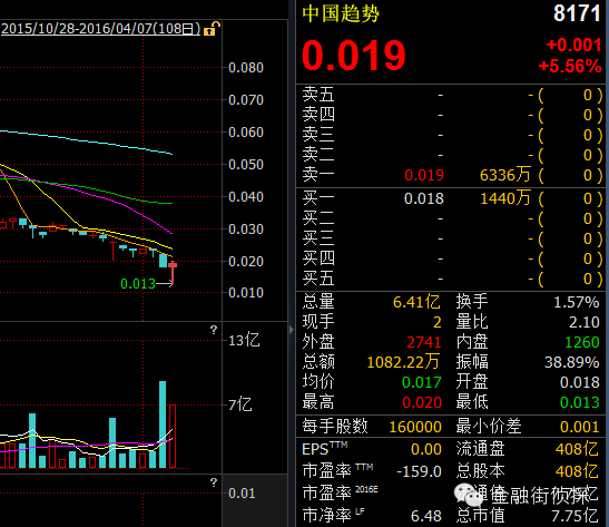 中国趋势(08171.HK)的跌幅次之,昨日下跌21.74%,最终收盘价格0.018港元,今日先跌后涨,最终收报于0.019港元,已经逼近了0.01港元的最低报价,几乎是跌无可跌。