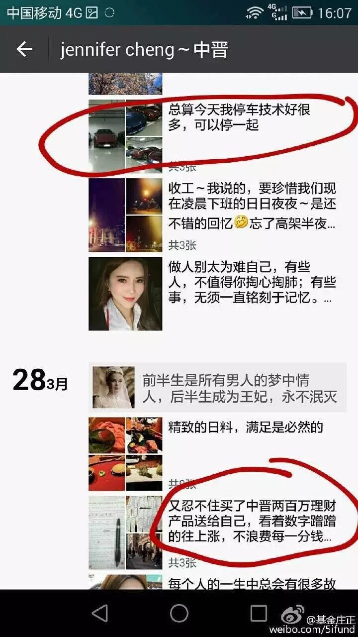 还有@基金庄正 也爆料了“中晋系”美女投资顾问程明的朋友圈。大家再感受下,画风是这样的: