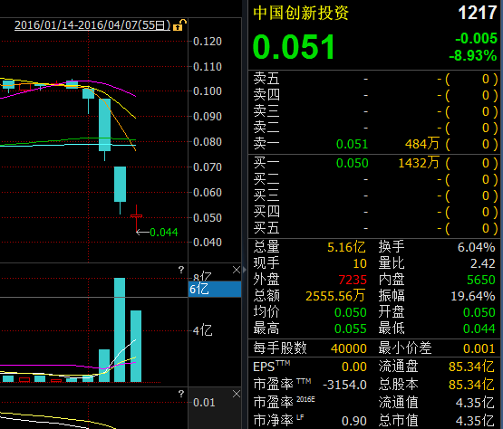 受到公司涉嫌违法经营、实际控制人被截获的消息影响,国太控股旗下的三家香港上市公司股价均惨遭血洗,其中,中国创新投资(01217.HK)跌幅最大,昨日下跌26.32%,最终收报于0.056港元;今日股价继续下跌8.93%,报收于0.051港元。