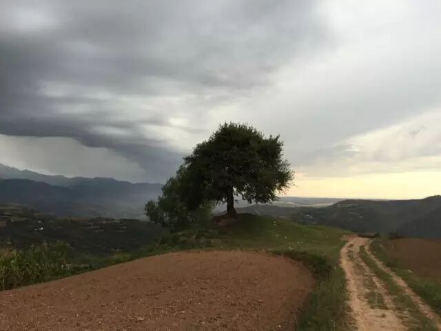 阿姑山的山顶上孤零零立着一棵树,据说是“神树”,有百年历史。一条长长的塑料布挂在树上,风吹起,长长飘动。雨滴落下,砸在骑摩托车的人脸上像冰雹一样,生疼。路边的中年人赶着牛慢慢回家。老奶奶和小女孩背着干草走到了家门口,爬最后一段坡,并不显得吃力。盘山公路上几乎没人,林风飒飒,树木摇摆。