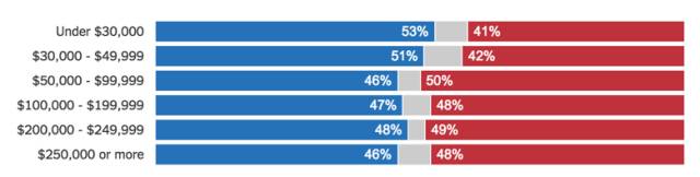 (蓝色为支持希拉里的投票比例,红色为支持特朗普的投票比例。来源:2016年选举出口民调,http://www.nytimes.com/interactive/2016/11/08/us/politics/election-exit-polls.html )