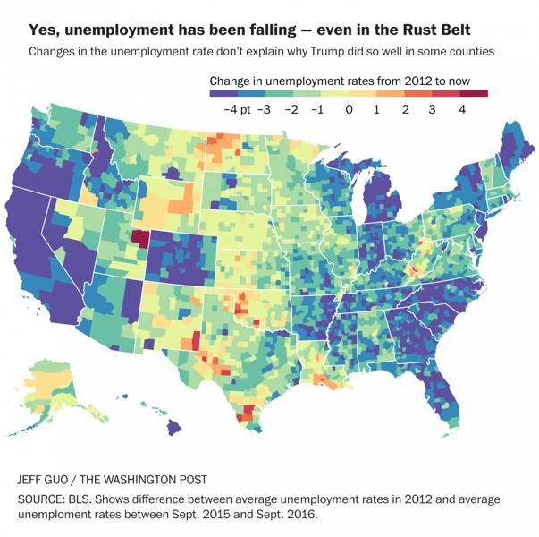 (美国失业率从2012年以来的变化光谱,蓝色一端为降低,红色一端为增加。来源:https://www.washingtonpost.com/news/wonk/wp/2016/11/11/yes-working-class-whites-really-did-make-trump-win-no-it-wasnt-simply-economic-anxiety/ )