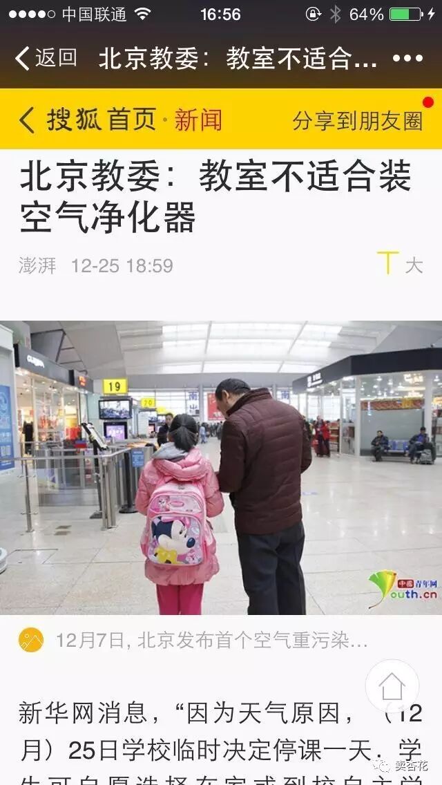 其他城市当然也纷纷与首都保持一致。我大学宿舍上铺的兄弟波波斯基家在郑州,他今天在我朋友圈跟帖道,“我自己出钱买的净化器给俺妞她班上送去,又被老师给退回来了”。