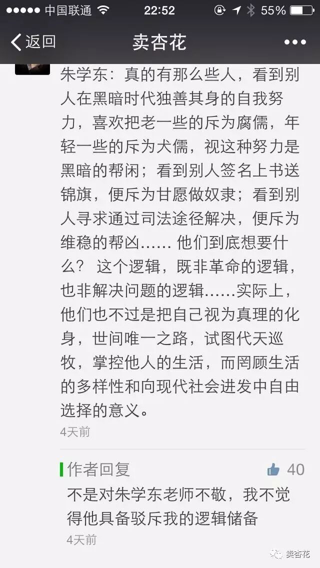 与之相辅,则是以人身攻击和道德贬斥来代替对不同观点的归纳,直接将对方的表达,判决为一场居心叵测的作恶。举个例子,在LY校友团的争论中,朱学东老师对我的攻击,便属于此类: