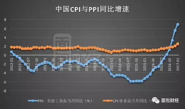 下图为面包财经根据国家统计局数据绘制的中国CPI(非食品类)与PPI同比增速: