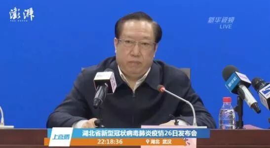 2020年1月26日,“湖北省新型肺炎疫情防控工作新闻发布会”召开,省长王XD先是迟到,后在说到全省口罩生产时,又几次改口,一是对数字概念不清,二是对生产情况不明;而市长周XW则坦言武汉物资缺乏,并首次表态“只要有利于疫情控制,我们(市委书记马GQ与市长周XW)愿意革职以谢天下”。