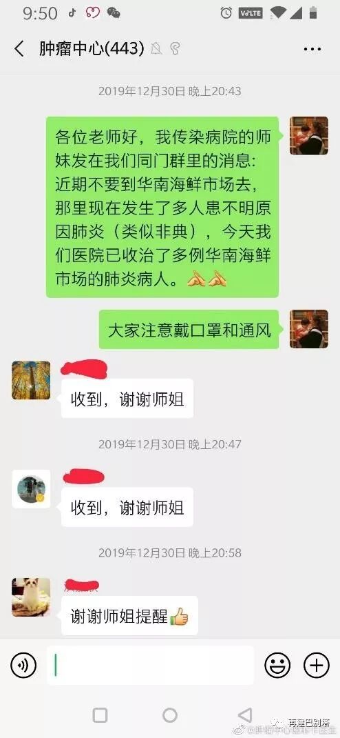 2019年12月30日晚上8点43,谢琳卡在她的肿瘤中心微信群内发出警示:“各位老师好,我传染病院的师妹发在我们同门群里的消息:近期不要到华南海鲜市场去,那里现在发生了多人患不明原因肺炎(类似非典),今天我们医院已收治了多例华南海鲜市场的肺炎病人。大家注意戴口罩和通风。