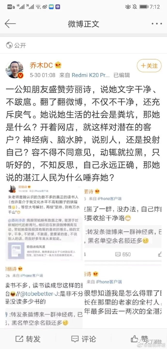 没想到,乔教师记性好,在我赞劳丽诗之后,截我屏攻击劳姑娘,我跟劳姑娘认识多年,虽然没见过几次,但文字熟悉,比乔教授为割韭菜蹭流量临时看了劳姑娘的几条微博要深许多。所以不忿乔教授之肮脏卑鄙,直接回了。乔教授翻出疫期我委婉提醒批评之言,指控我造谣污蔑,才有昨日之怼。