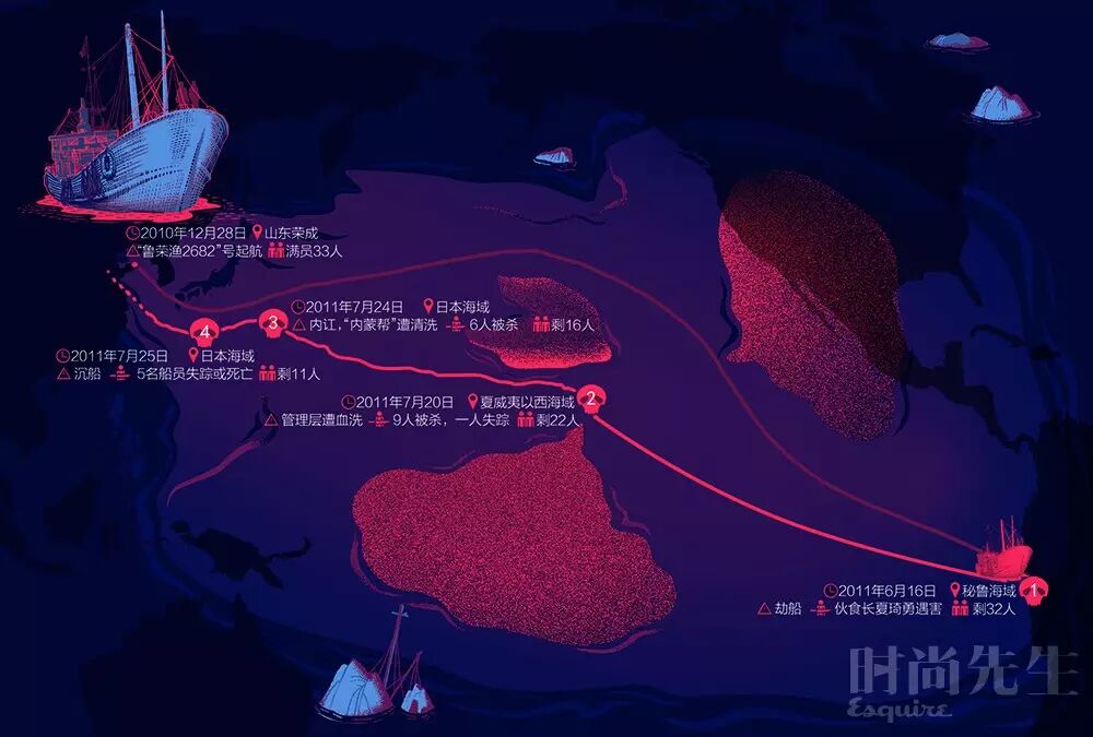 为受访者考虑,此为化名。当时的船员赵木成因卷入杀戮事件被“判处有期徒刑四年”,我去找他时他刚好羁押期满。初次见面地点是条寒风吹拂的乡村公路。他不满30岁,面庞粗糙黝黑,眼角耷拉,矮壮的身躯裹在土黄色的夹克里,像是从一百年前的照片里走出来的人,带着那种时不时望向你背后的、犹疑的眼神。他问我,想知道些什么?答案是显而易见的:我想知道人。