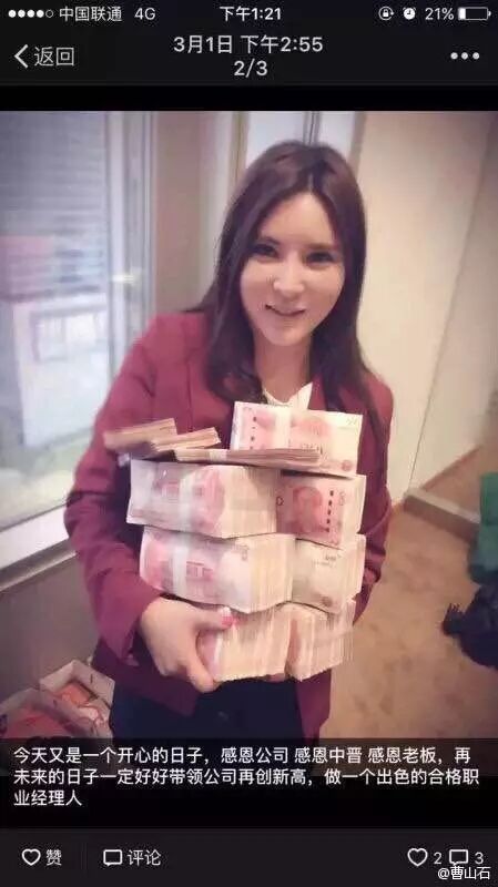 “中晋系”美女实在是太高调了,令人不忍直视。用曹山石微博图片一张,大家感受一下中晋88部大客户经理扑面而来的土豪气质。